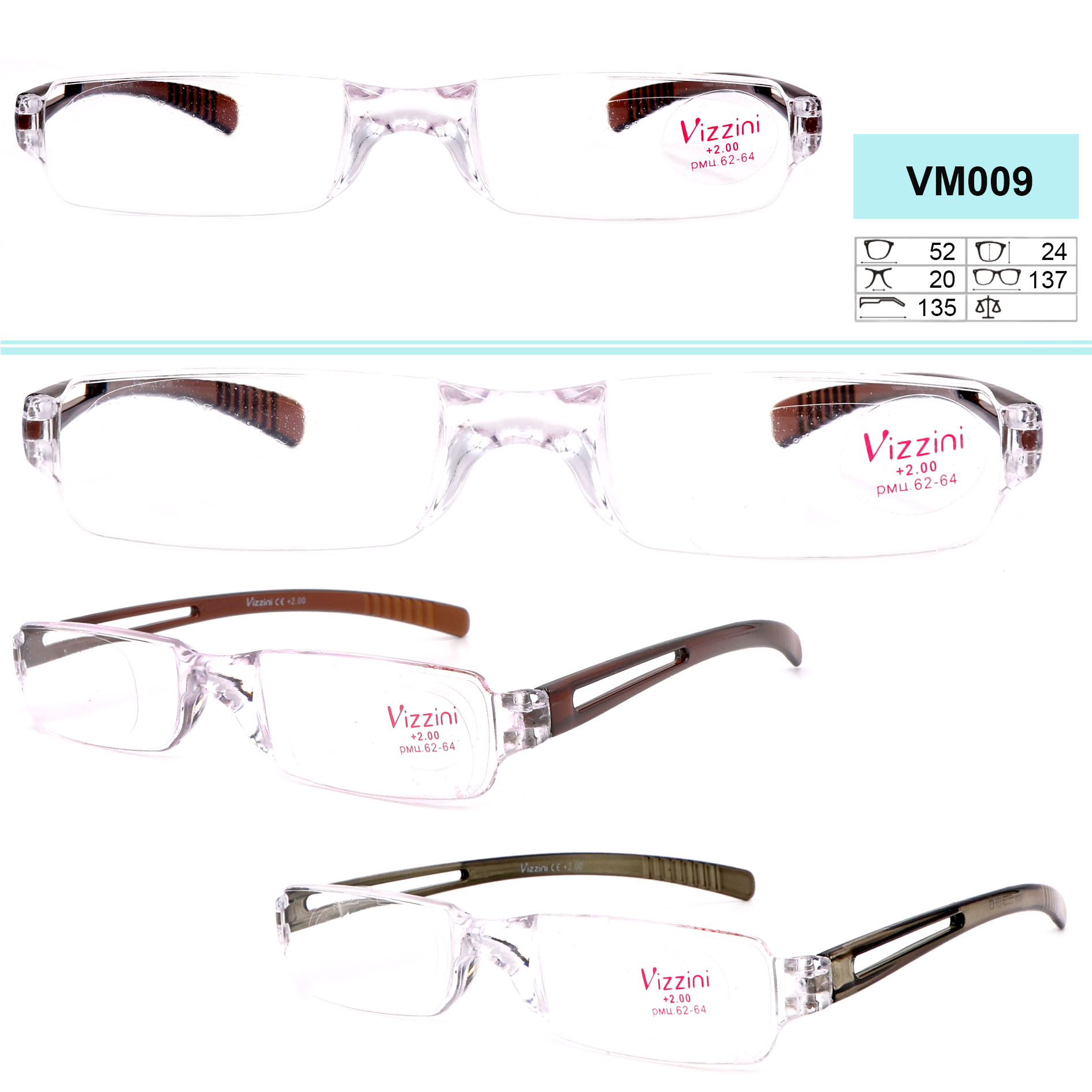 Очки корригирующие Vizzini в пластиковой оправе (ободковые, безободковые, на леске, в футляре и без футляра, мужские, женские, унисекс). Линзы в очках центрованы 62-64. Предложены варианты по цвету линз. Выбирайте. Рекомендуем для оптовой и розничной продажи.