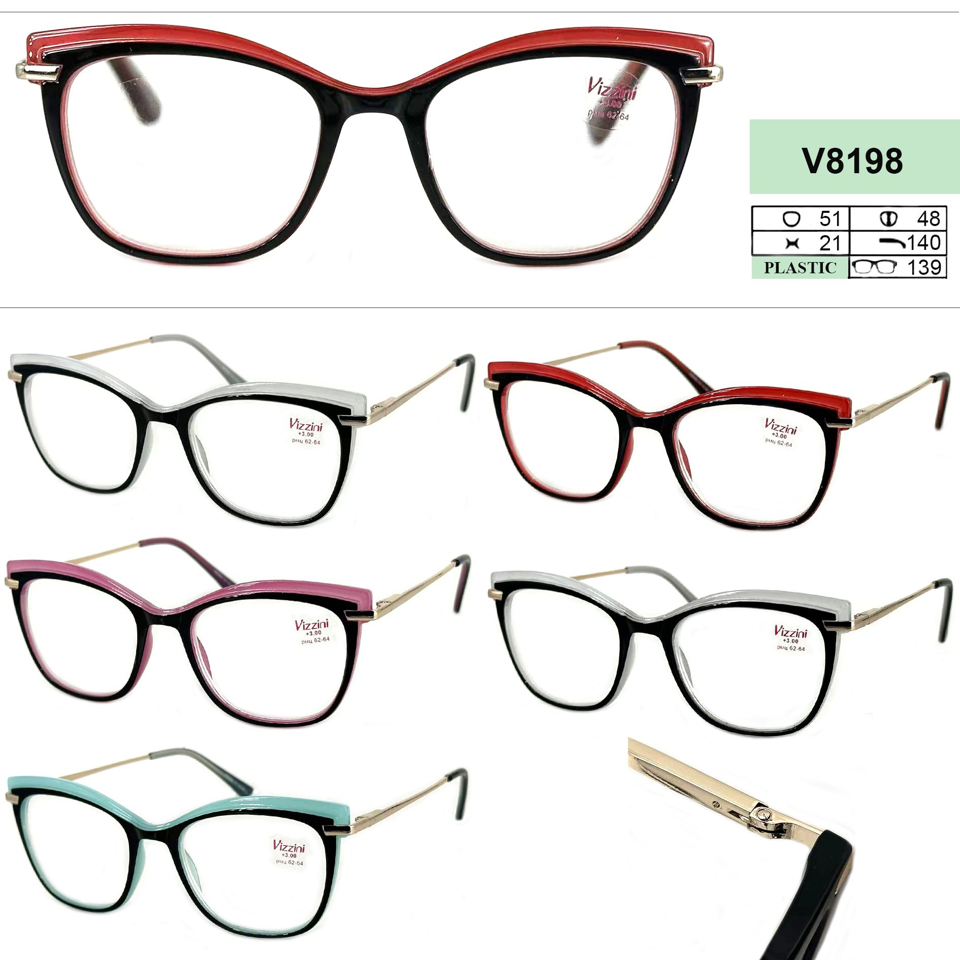 Очки готовые женские в пластиковой оправе Vizzini V8198, диоптрии от +1.00 до +4.00 (шаг 0.25); от -1.00 до -4.00 (шаг 0.5)