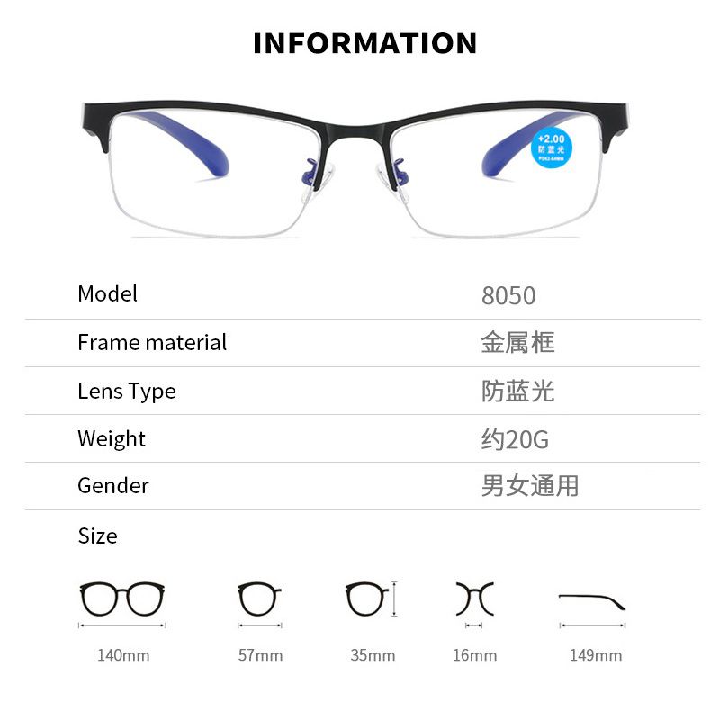 Очки для чтения полуободковые мужские металлические с защитой Blue Ray Cut KY8050, диоптрии: от 0.00 до +4.00