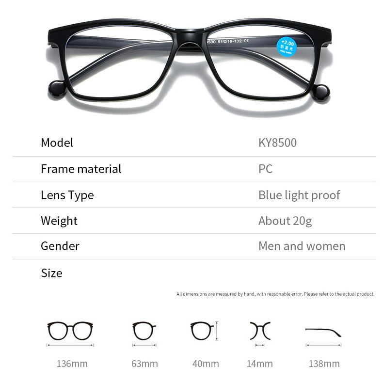 Очки пластиковые для чтения KY8500 с защитой Blue ray cut, диоптрии от 0.00 до +4.00, РМЦ=62-64