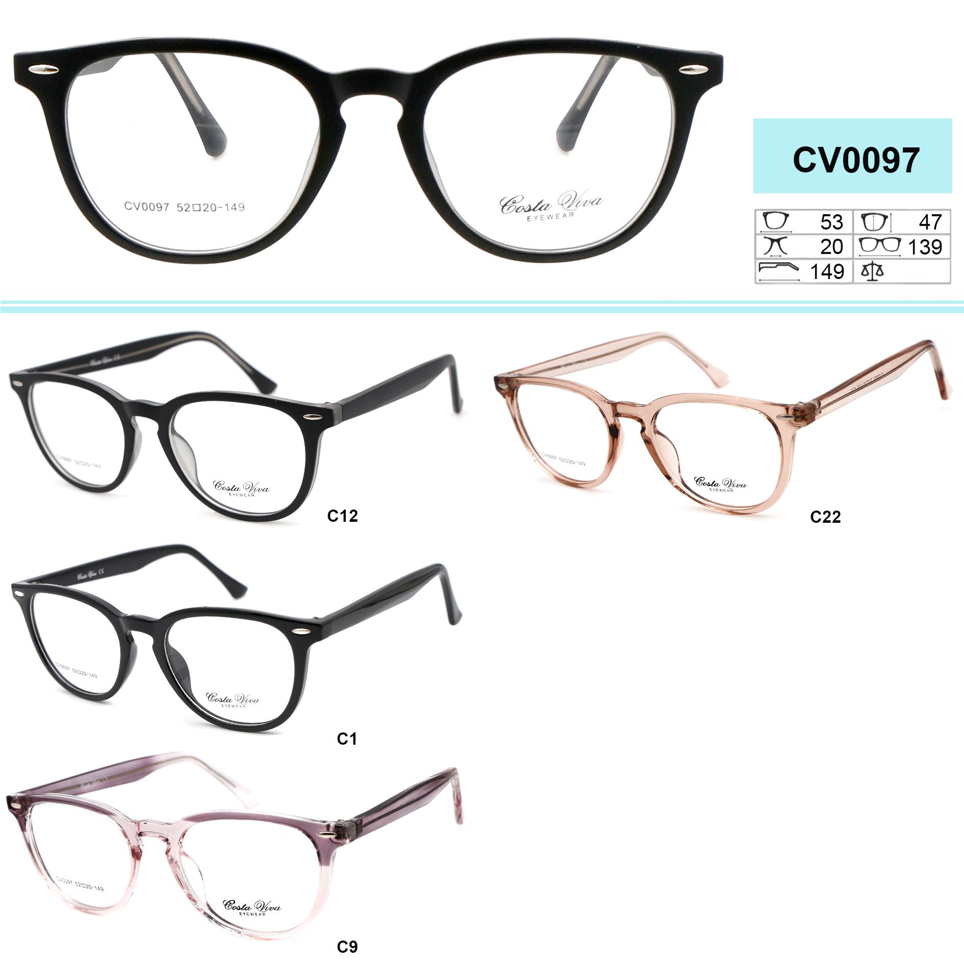 Пластиковые оправы для очков Costa Viva. Оправы хорошо держат свою форму, в тоже время эластичны в работе при изготовлении очков, высокого качества, имеет приятные тактильные свойства, устойчивы к повреждениям, легки, обладают гипоаллергенными свойствами. Многие модели декорированы стразами, с элегантными заушниками и флексами. Модный дизайн. Данная коллекция оправ высокого качества, проходит штучный контроль. В нашем магазине дана низкая цена на товар данной категории, для оптовой продажи. Стандарт CE (европейский стандарт качества).