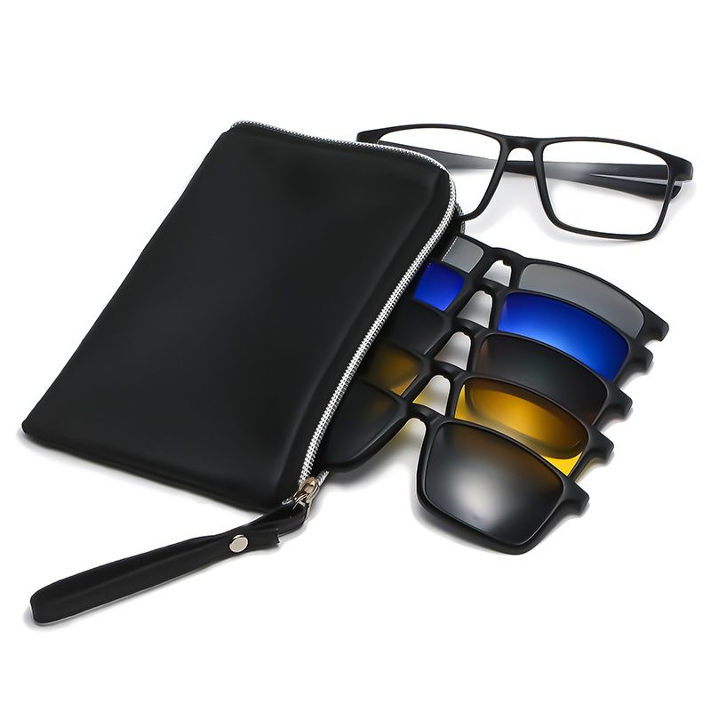 - Комплект: оправа пластиковая + 5 солнцезащитных насадок + кожаная сумка