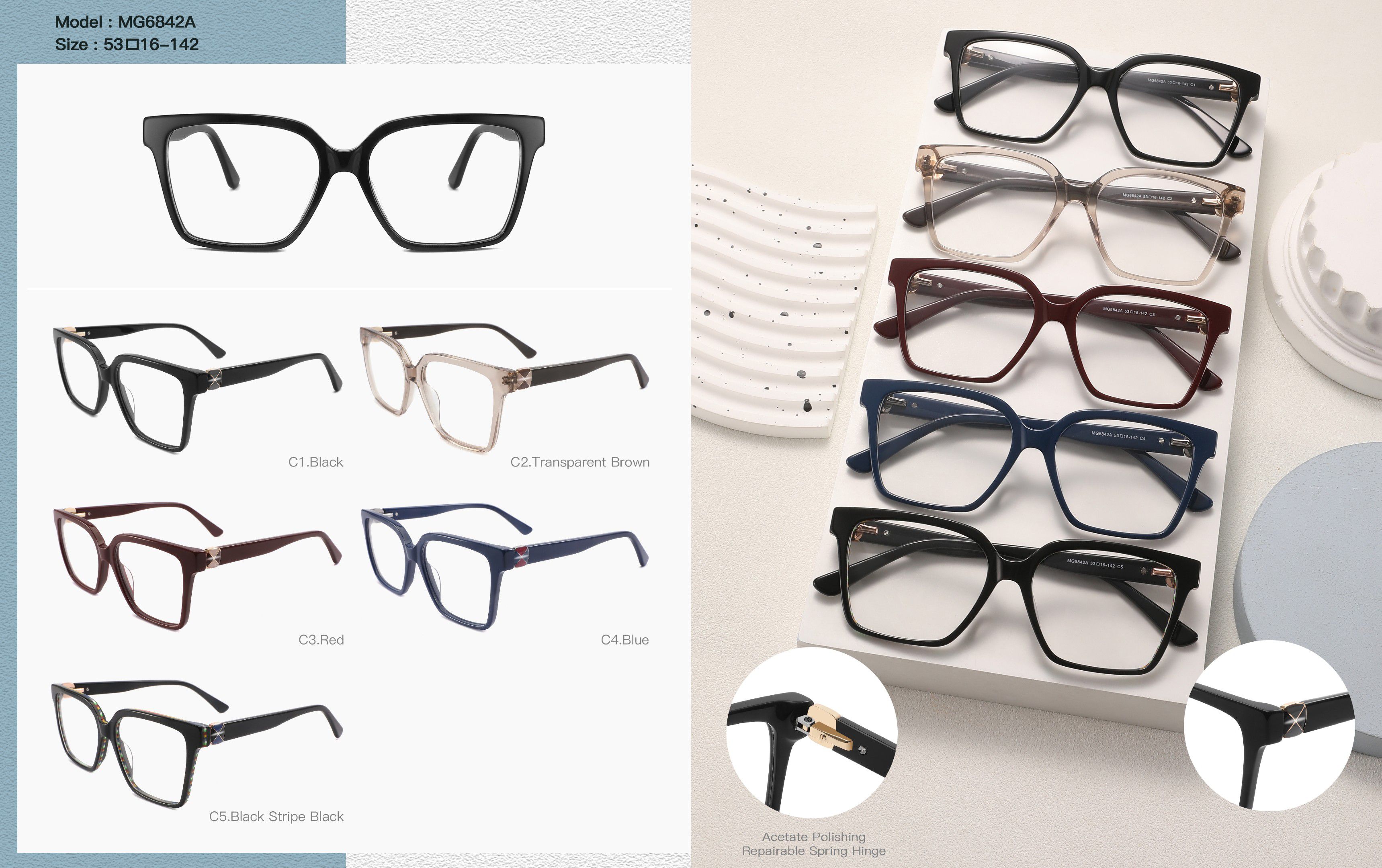 Оправы изготовлены из ацетата целлюлозы — прочного, легкого и гипоаллергенного материала, который хорошо сохраняет форму и обладает эластичностью при работе. Они устойчивы к повреждениям, приятны на ощупь и отличаются высоким качеством исполнения. Многие модели украшены стразами, имеют элегантные заушники с флексами и современный дизайн. Каждая оправа проходит индивидуальный контроль качества. В нашем магазине установлены выгодные оптовые цены на продукцию данной категории.