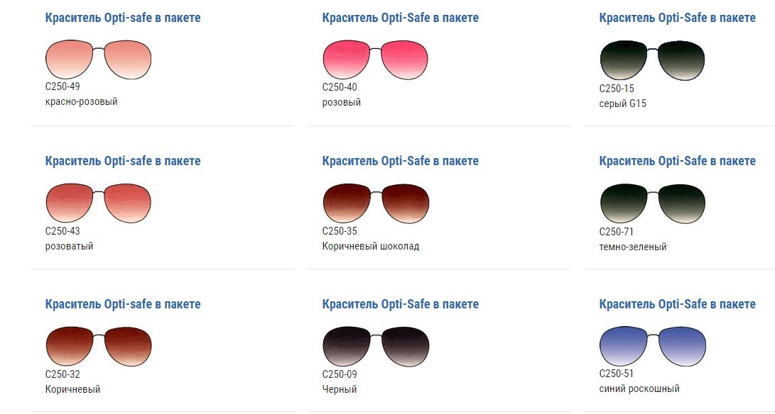 OptiSafe® powder pigment for plastic lenses were invented by Phantom research laboratories after several years of research and development. They are the most advanced available colors for lenses today, provides the most consistent, uniform color in a short amount of time. The molecular composition of the dyes allows you to quickly penetrate into the matrix of the lens, connecting the lens and providing excellent resistance to fading. Plastic CR-39™ (coated and uncoated), polycarbonate lenses can be successfully painted by OptiSafe dye powder. Choose from a great variety of colors to tint virtually every pair of sun and corrective lens prescription recipe for customer satisfaction. Available in package: water soluble upakovochnye with the dye and packaged in standard 10 packs.