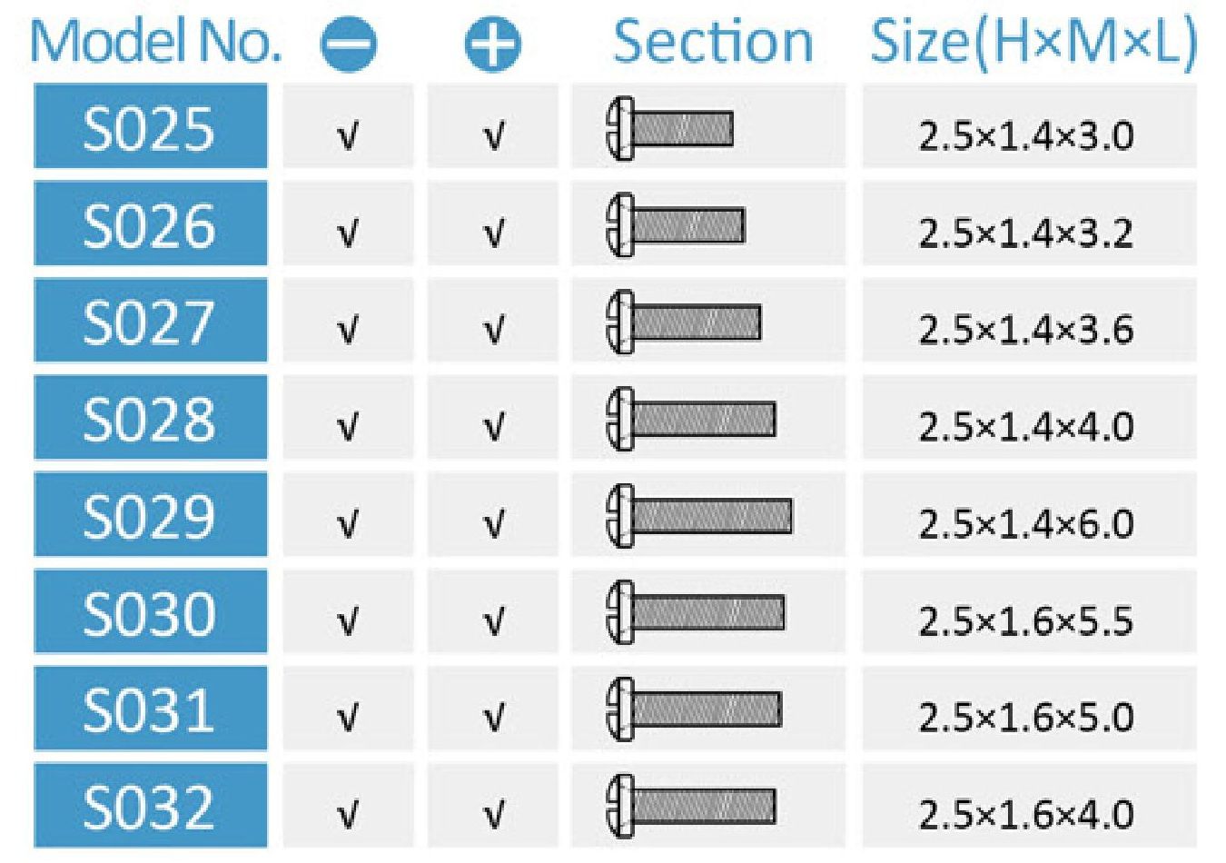 - S032 - 2.5*1.6*4.0 мм, шлицевой/крестовый