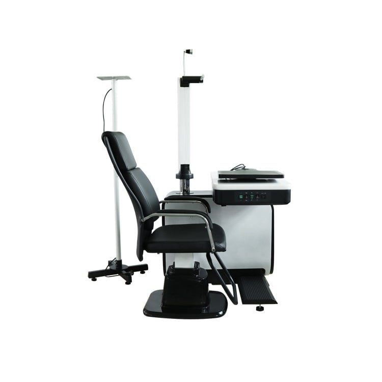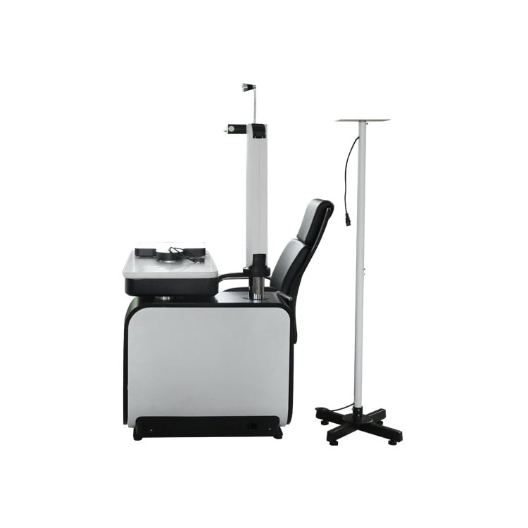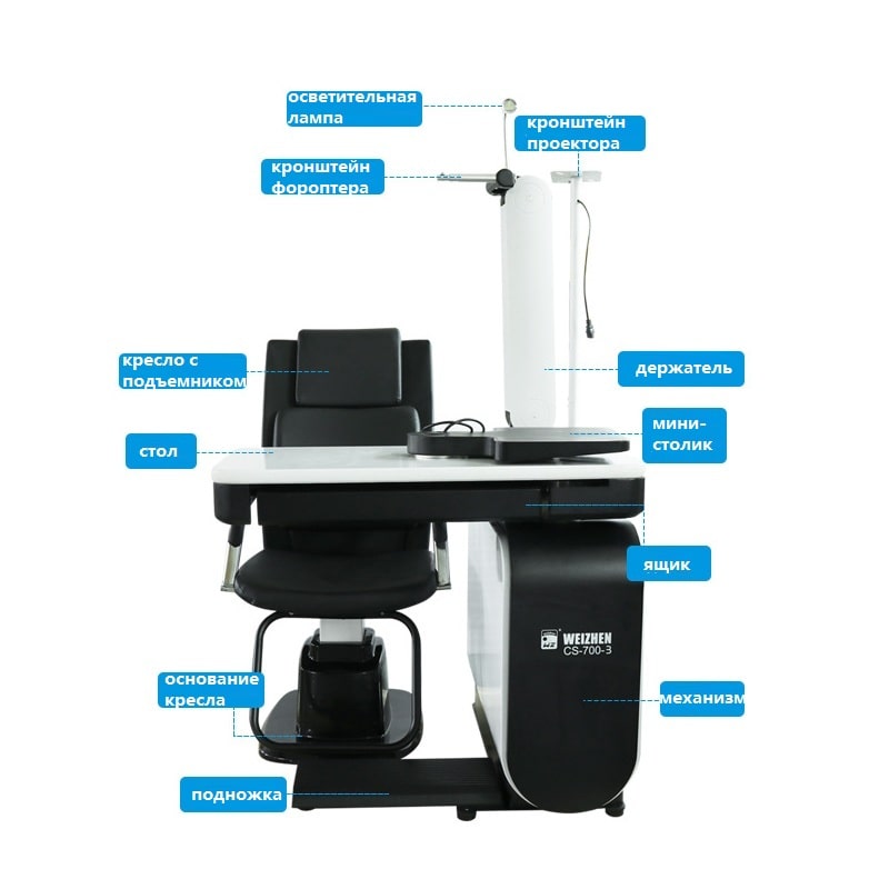 Модель включает в себя всё необходимое для проведения офтальмологических обследований. Удобная столешница с выдвижным ящиком, кресло с электроподъёмным механизмом регулируется по высоте. Откидывающиеся спинка и подлокотники способствуют обеспечению высокого уровня комфорта для пациентов. В верхней части рабочего места офтальмолога располагается лампа, угол наклона которой можно изменять. Для закрепления проектора знаков предусмотрен встроенный кронштейн. Аналогичная конструкция имеется и для фороптера.