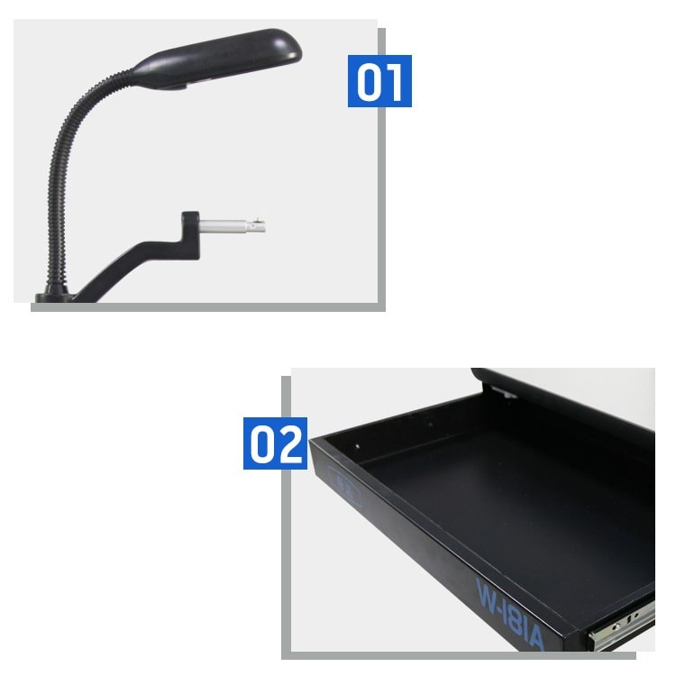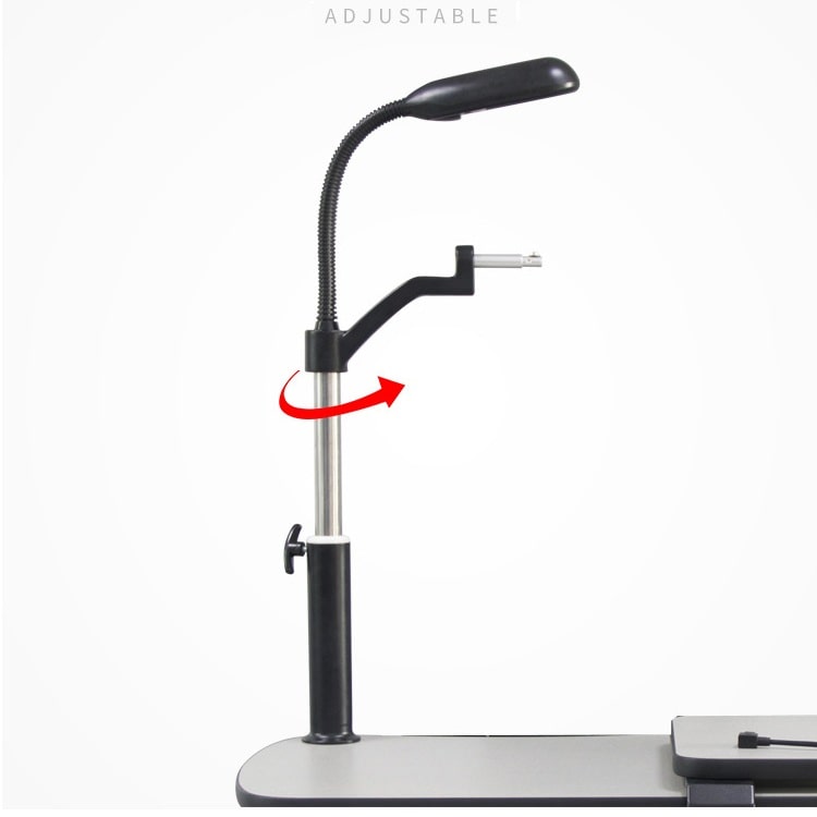 Модель включает в себя всё необходимое для проведения офтальмологических обследований. Удобная столешница с выдвижным ящиком, кресло с электроподъёмным механизмом регулируется по высоте. Откидывающиеся спинка и подлокотники способствуют обеспечению высокого уровня комфорта для пациентов. В верхней части рабочего места офтальмолога располагается лампа, угол наклона которой можно изменять. Для закрепления проектора знаков предусмотрен встроенный кронштейн. Аналогичная конструкция имеется и для фороптера.