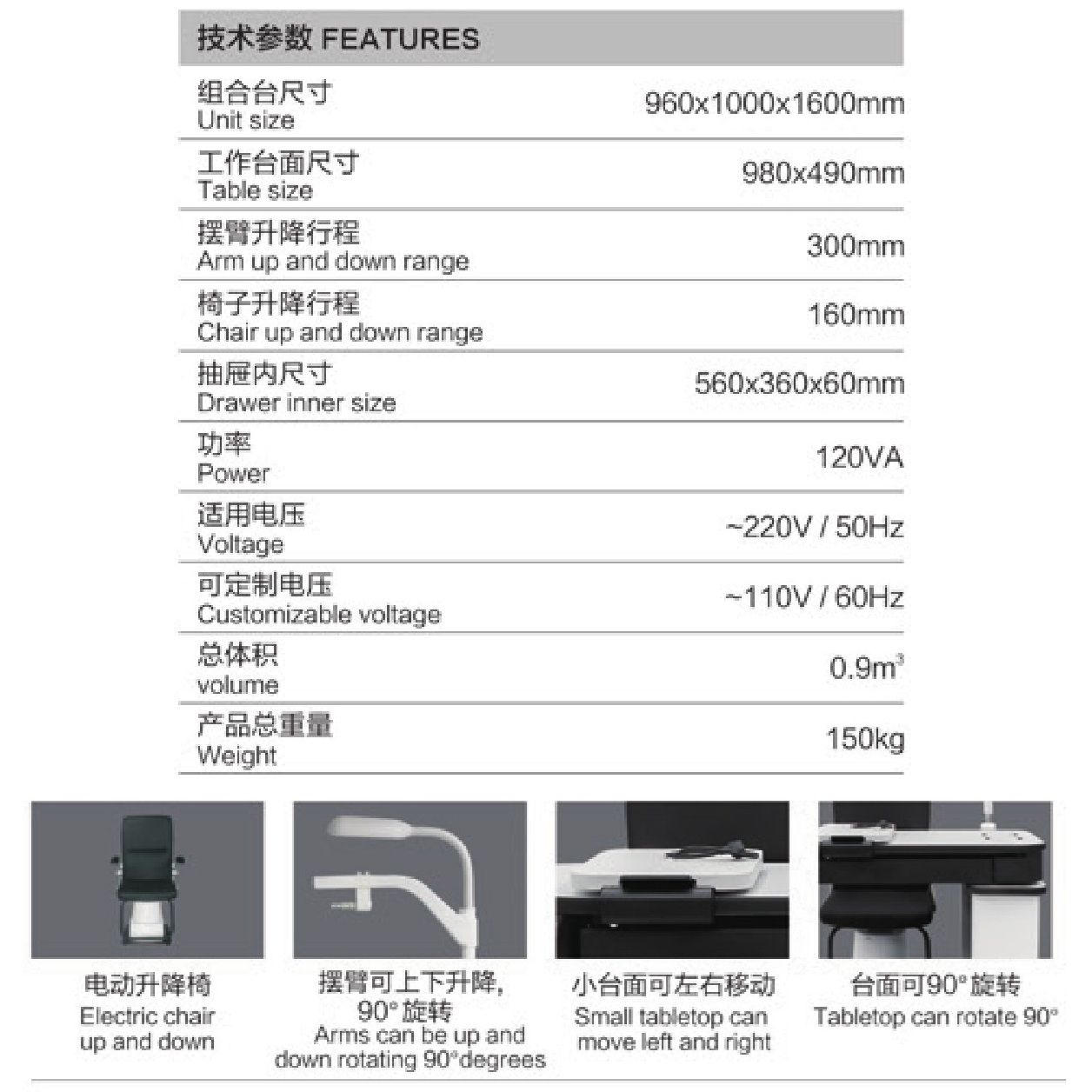 Модель включает в себя всё необходимое для проведения офтальмологических обследований. Удобная столешница с выдвижным ящиком и электроподъёмным механизмом регулировки по высоте. В верхней части рабочего места офтальмолога располагается лампа, угол наклона которой можно изменять. Для закрепления фороптера и проектора предусмотрены встроенные кронштейны. В комплект входит кресло.