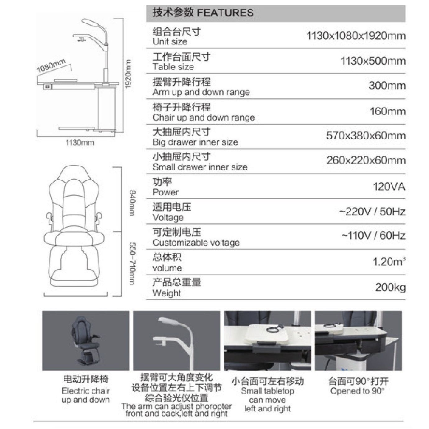 Модель включает в себя всё необходимое для проведения офтальмологических обследований. Удобная столешница с выдвижным ящиком и электроподъёмным механизмом регулировки по высоте. В верхней части рабочего места офтальмолога располагается лампа, угол наклона которой можно изменять. Для закрепления фороптера и проектора предусмотрены встроенные кронштейны. Оснащён небольшим радиальным ящиком для установки монтажной рамки или измерителя межзрачкового расстояния, USB-портом для зарядки и многофункциональной розеткой. В комплект входит кресло.