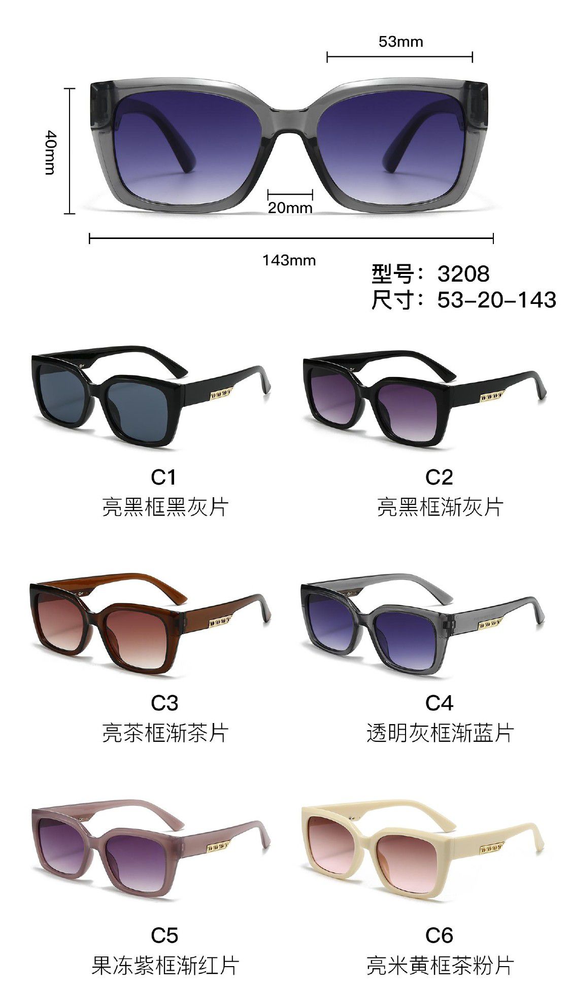 - Size: lens width - 53 mm, bridge distance - 20 mm, temple - 143 mm