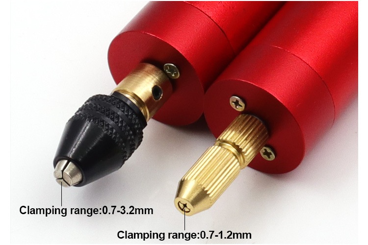 - Диапазон зажима для сверла: 0.7 ~ 1.2 мм (с золотым патроном) / 0.7 ~ 3.2 (с чёрным патроном)