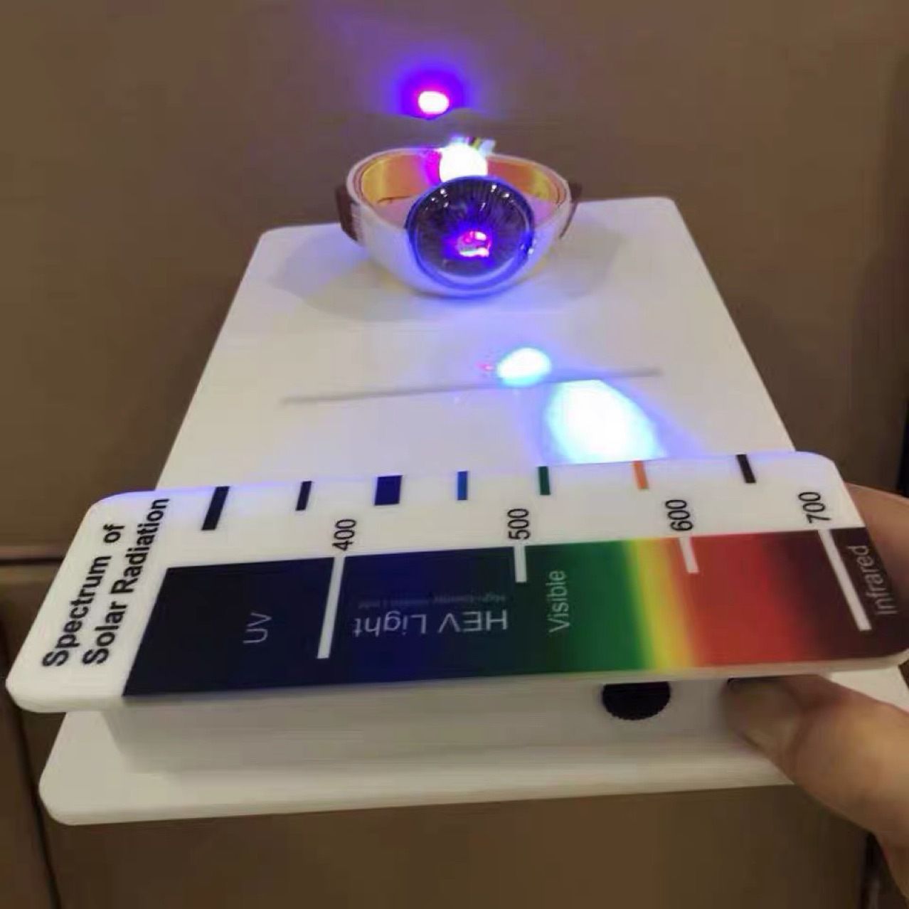 The universal tester will allow you to check lenses for UV transmission and check lenses for the presence of a coating that protects against blue light.