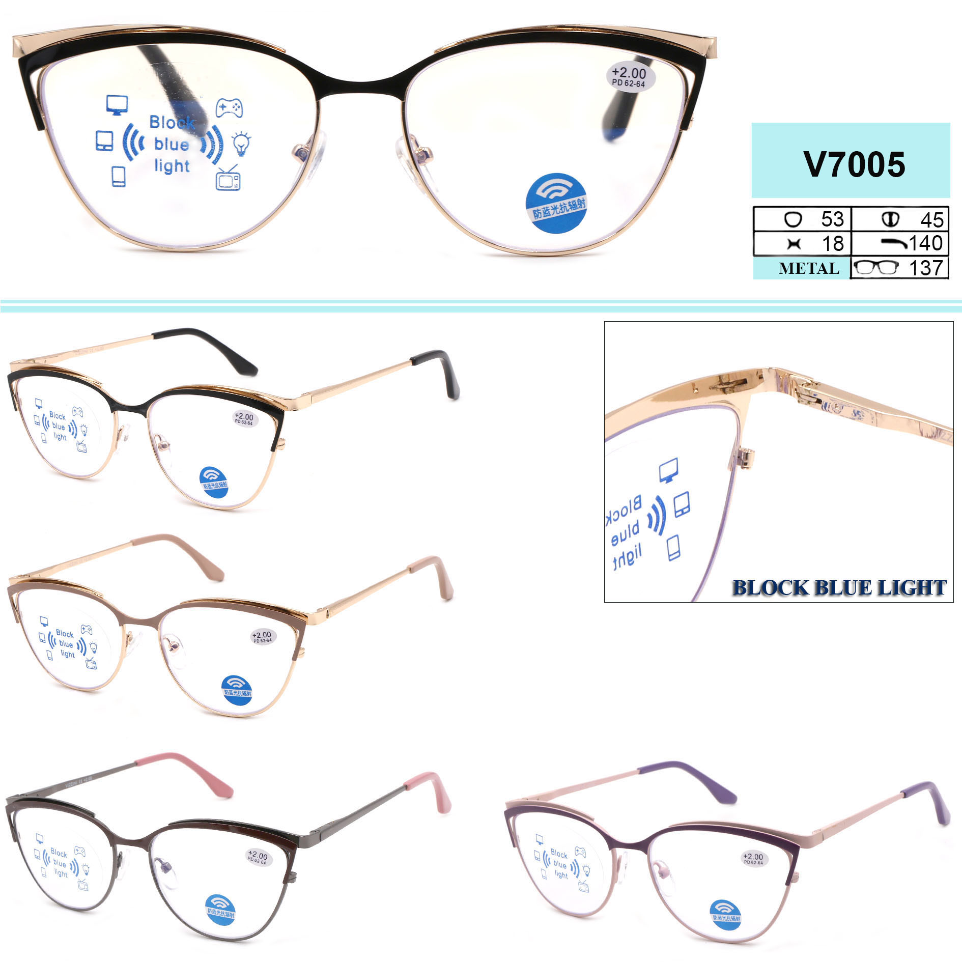 Women's metal eyeglasses with flex hinges Vizzini V7005 BLUE BLOCK LIGHT Diopters: +0.75 to +6.00 (step 0.25); -1.00 to -8.00 (step 0.25)