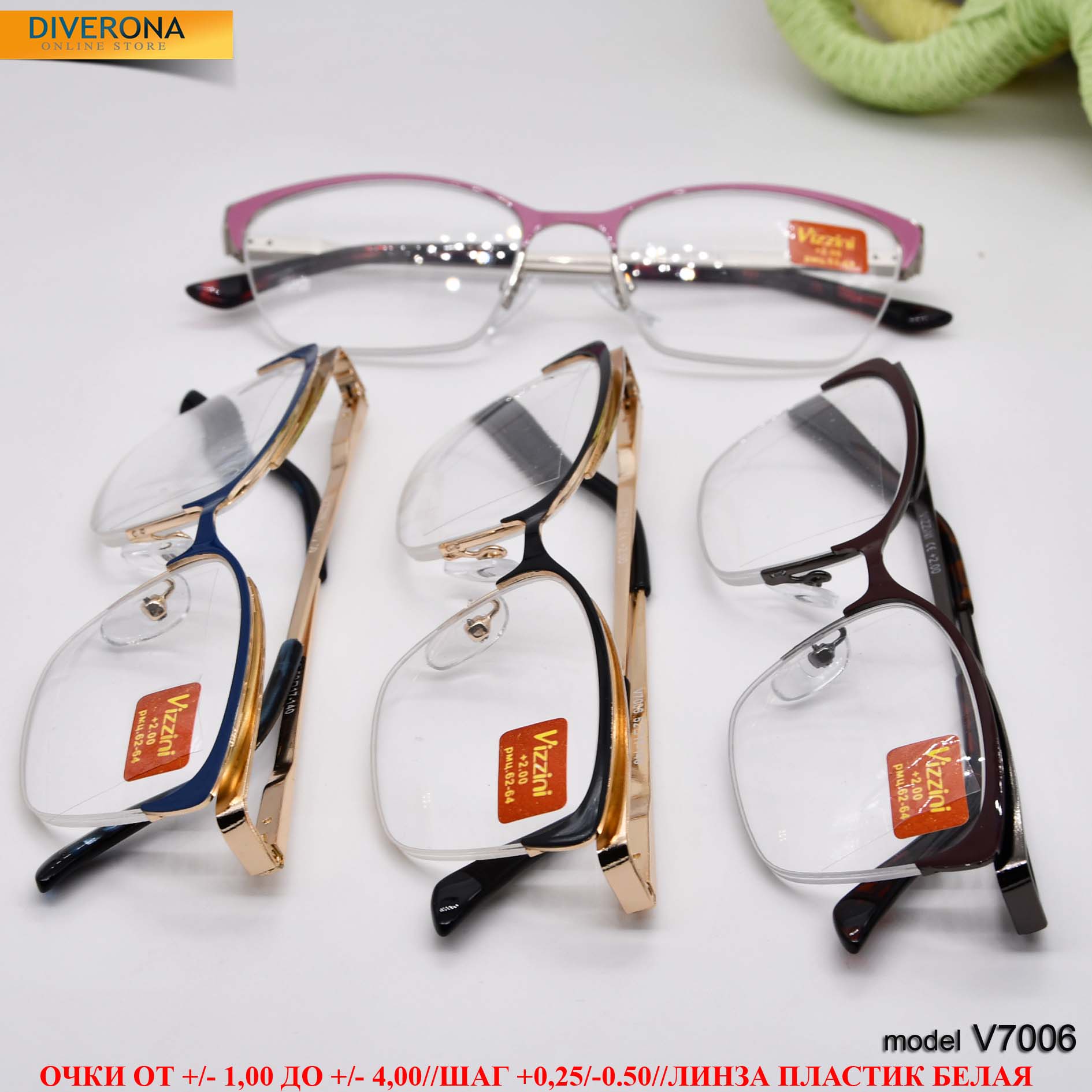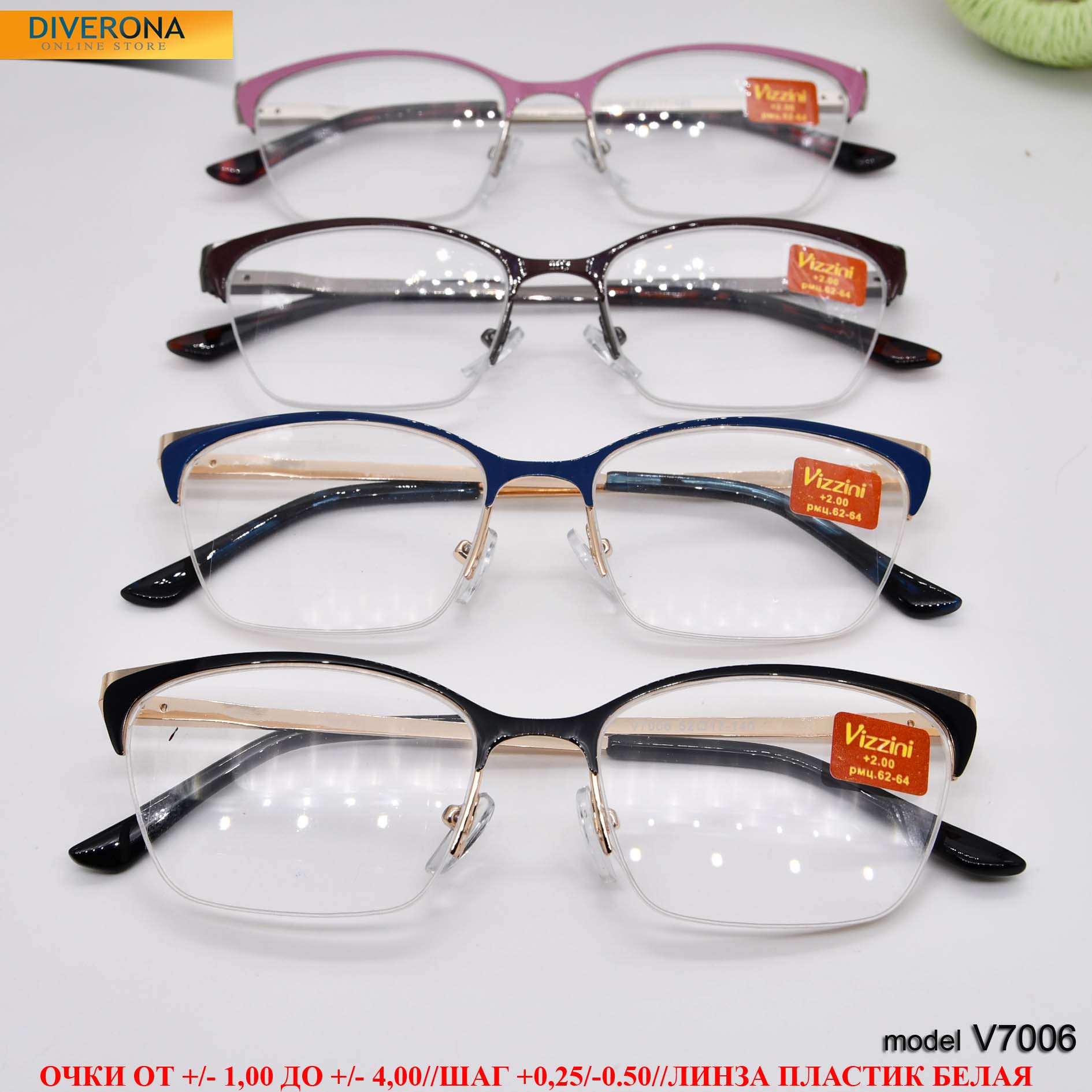Women's metal eyeglasses with flex hinges Vizzini V7006, dioptries +1,00 to +4.00 (step 0.25); -1.00 to -4,00; 6,50 to -8.00 (step 0.5)