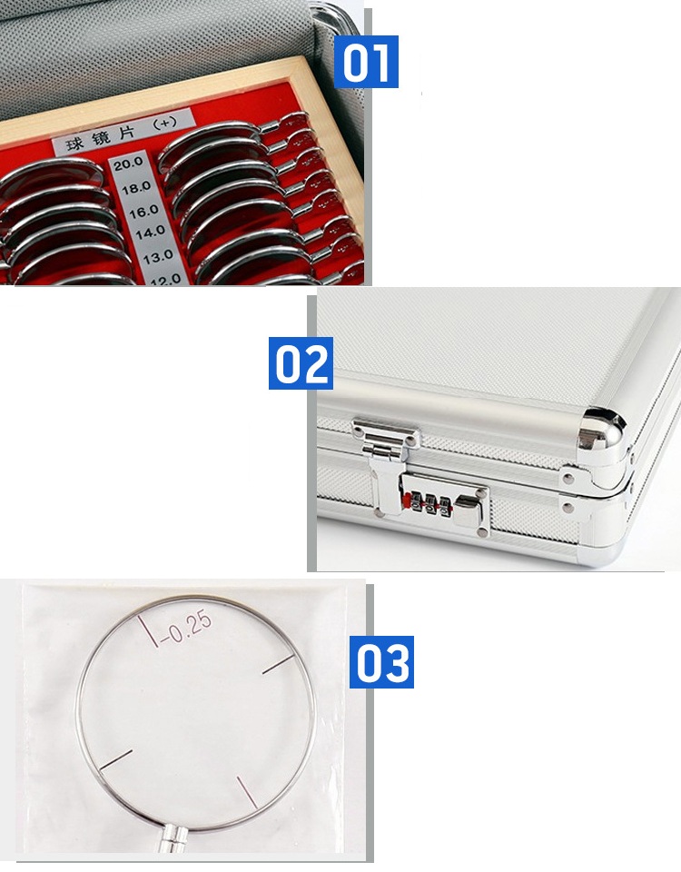 Sets of trial spectacle lenses with a frame for 266 lenses. Designed for examining visual impairments, for example, myopia, hyperopia, astigmatism and presbyopia, for examining strabismus and color blindness. A set of test spectacle lenses is used in the ophthalmology departments of hospitals, clinics, and optical stores. It is convenient to use both in hospitals and in mobile rooms.