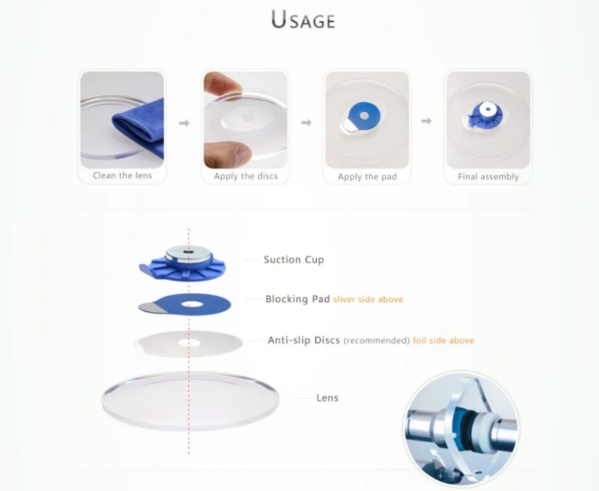 Lens blocking pads with double-sided adhesive coating provide superior fixation of all types of lenses (CR-39, polycarbonate, Hi-index, glass) with any coating that prevents displacement of the lens during processing. After removing the pads on the lens does not leave any traces.