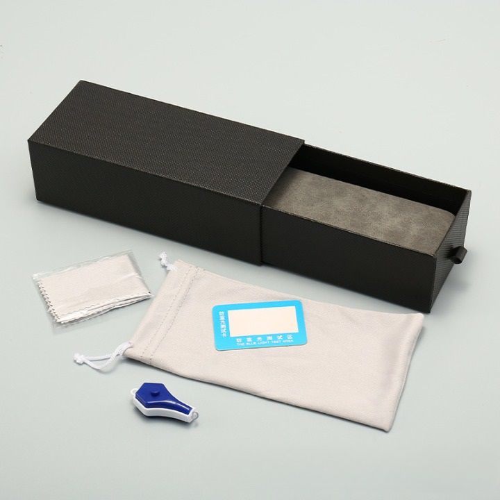 - Packaging: general plastic bag, includes packaging box, soft case, cloth for cleaning glasses, card and flashlight for blue light test