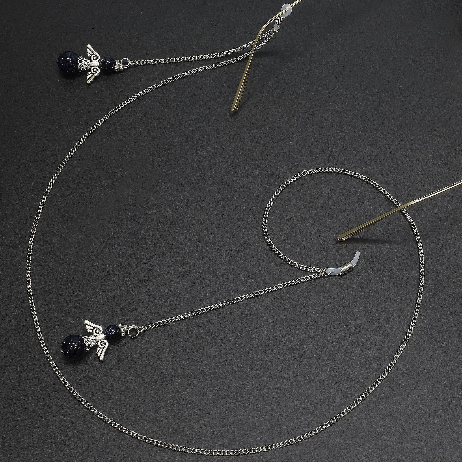 Металлическая нескользящая цепочка серебряного цвета, с черным натуральным камнем, для очков и масок GL272