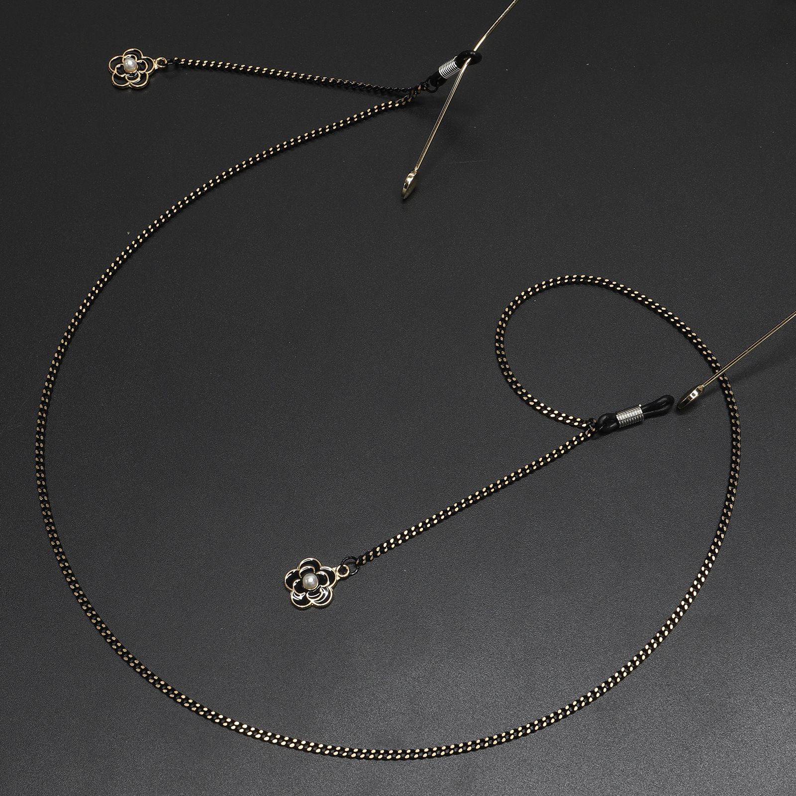 Black-colored metal non-slip chain, with pendant black flower and pearl, for glasses and masks GL490