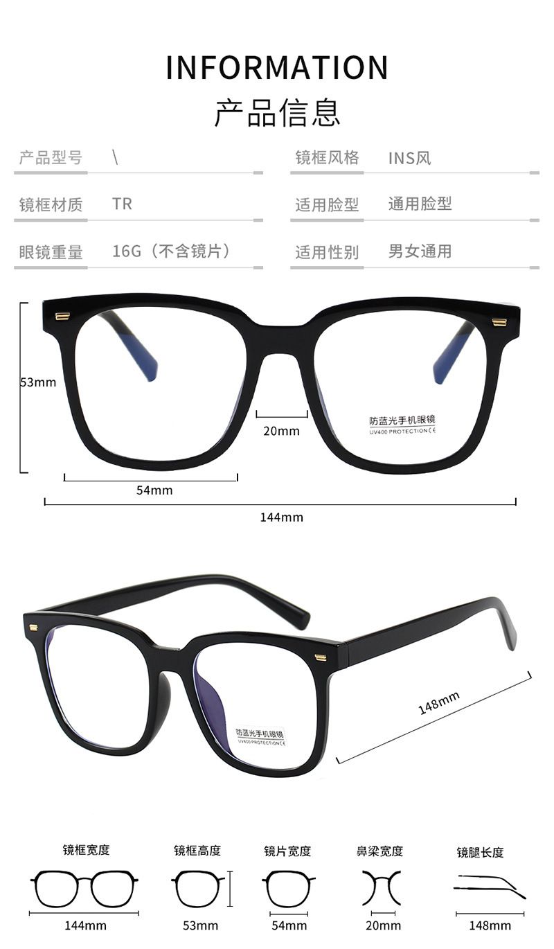 - Size: lens width - 54 mm, bridge - 20 mm, temple - 148 mm