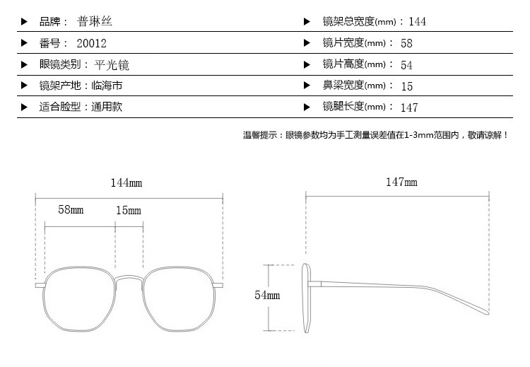 - Size: lens width - 58 mm, bridge - 15 mm, temple - 147 mm, total width - 144 mm, lens height - 54 mm