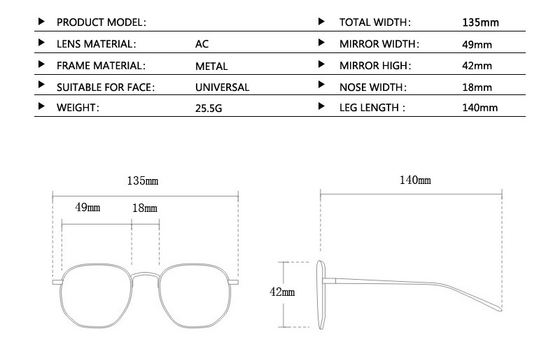 - Size: lens width - 49 mm, bridge - 18 mm, temple - 140 mm, total width - 135 mm, lens height - 42 mm