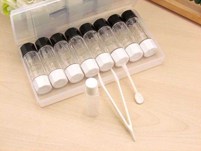 - Set includes: tweezers, containers - 8 pcs, stick, small bottle of care solution