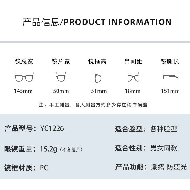 - Размер: общая ширина -145 мм, ширина линзы - 50 мм, высота линзы - 51 мм, мост - 18 мм, длина заушника - 151 мм