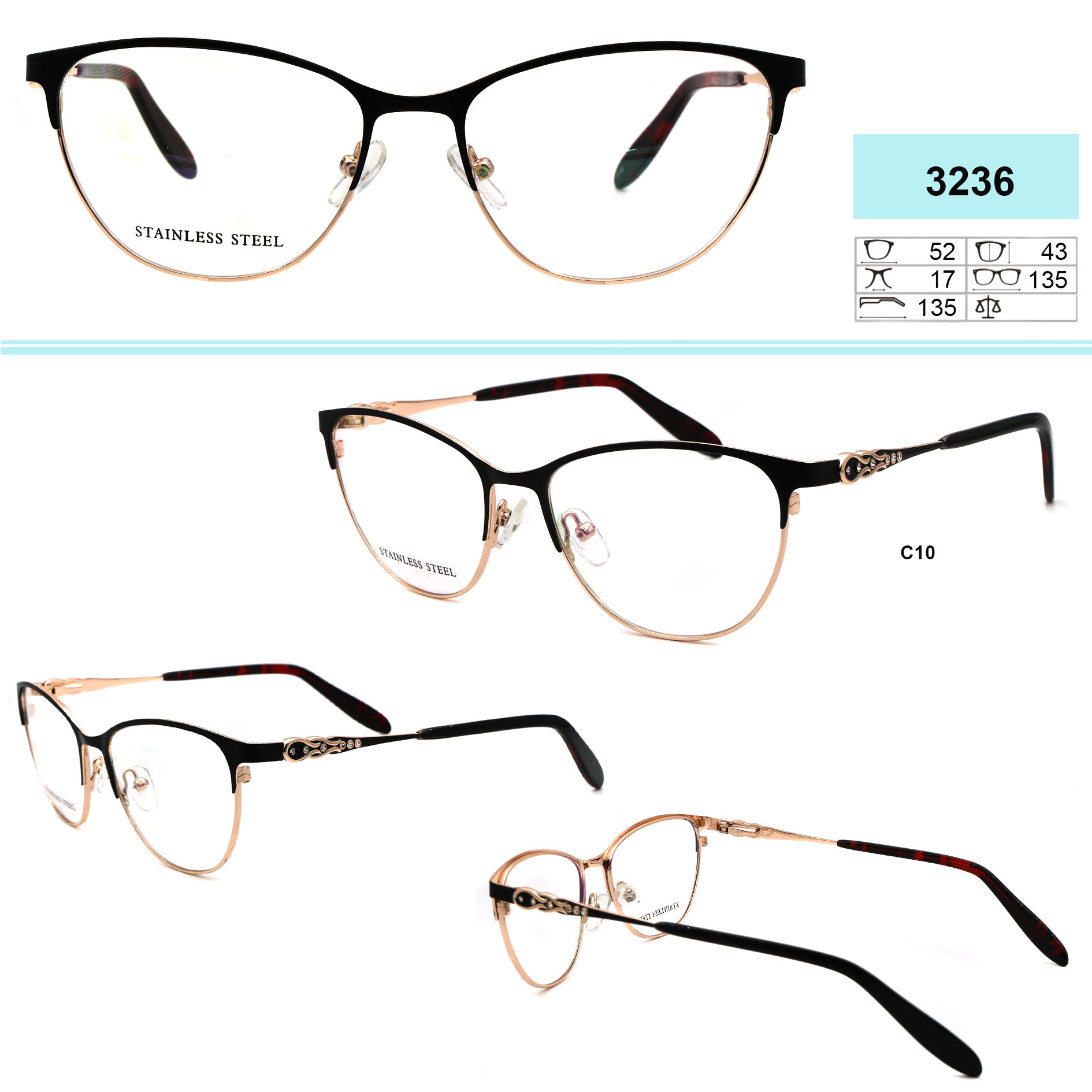 Оправы для очков металлические. Материал сталь (Stainless steel). Оправы хорошо держат свою форму, в тоже время эластичны в работе при изготовлении очков, высокого качества, имеет приятные тактильные свойства, устойчивы к повреждениям, легки, обладают гипоаллергенными свойствами. Многие модели декорированы стразами, с элегантными заушниками и флексами (flex). Модный дизайн. Данная коллекция оправ высокого качества, проходит штучный контроль. В нашем магазине дана низкая цена на товар данной категории, для оптовой продажи. Стандарт CE (европейский стандарт качества)