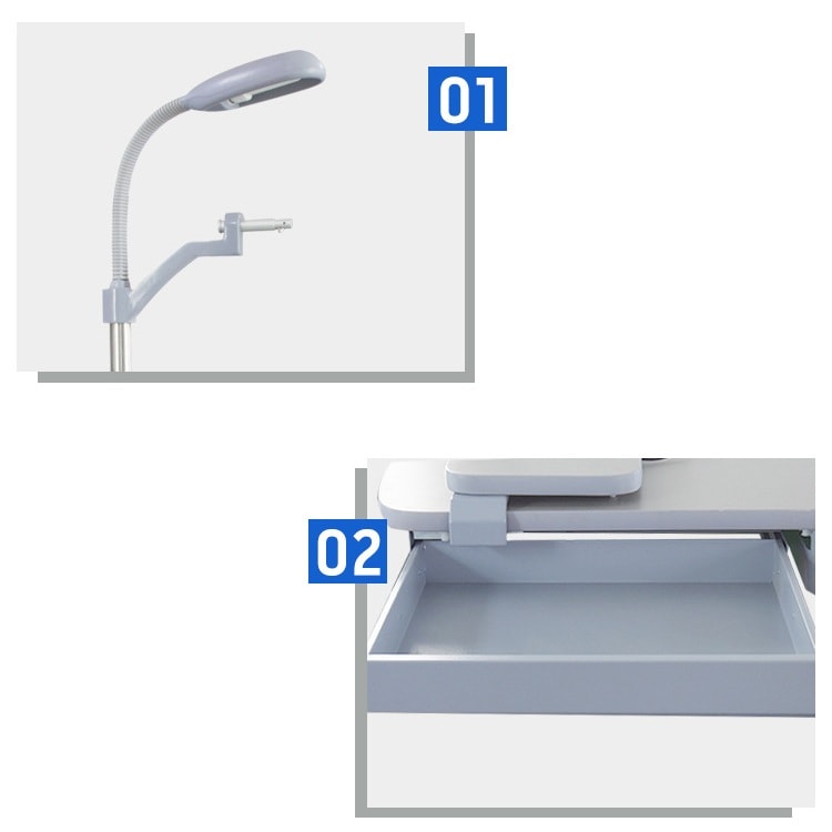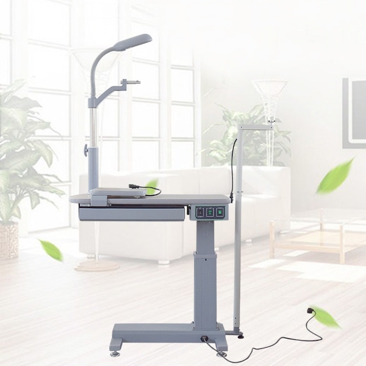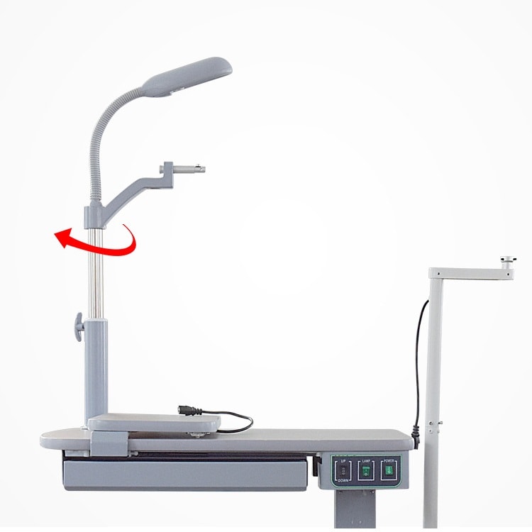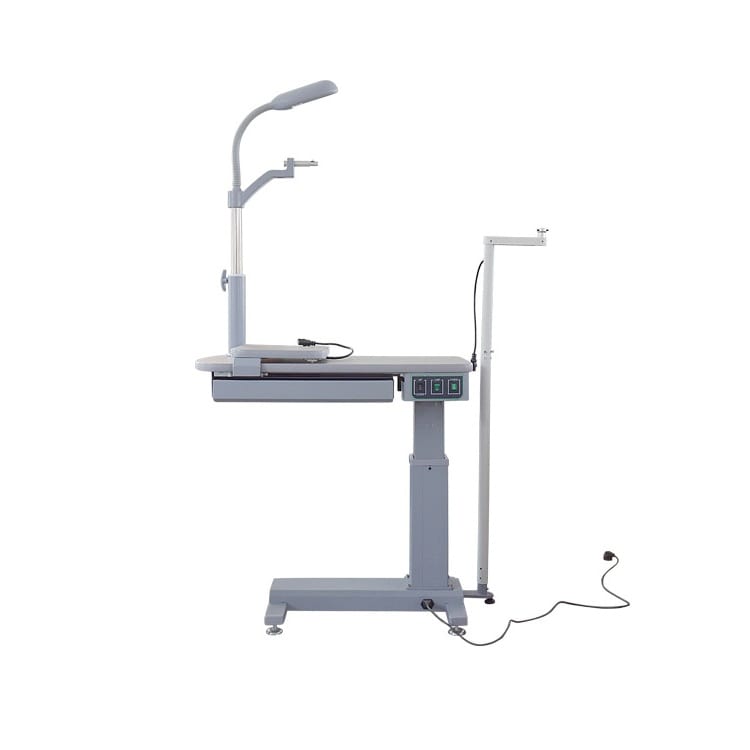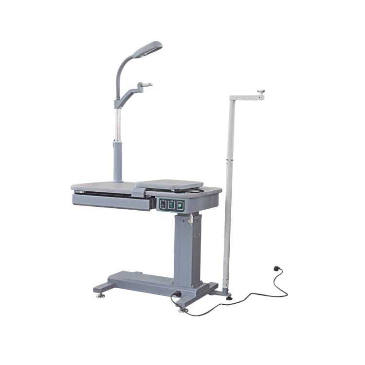 Модель включает в себя всё необходимое для проведения офтальмологических обследований. Удобная столешница с выдвижным ящиком, кресло с электроподъёмным механизмом регулируется по высоте. В верхней части рабочего места офтальмолога располагается лампа, угол наклона которой можно изменять. Для закрепления проектора знаков предусмотрен встроенный кронштейн. Аналогичная конструкция имеется и для фороптера.