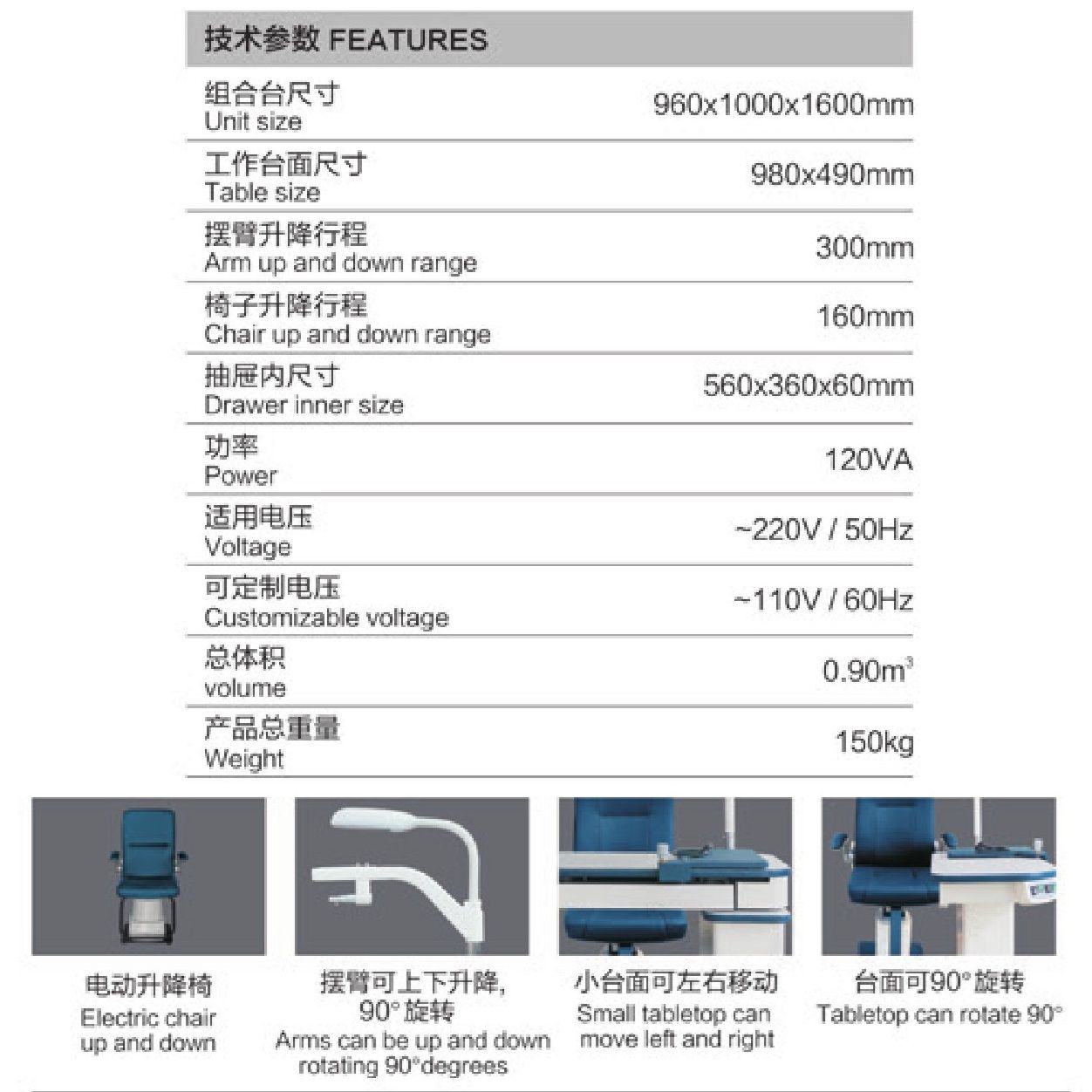 Модель включает в себя всё необходимое для проведения офтальмологических обследований. Удобная столешница с выдвижным ящиком и электроподъёмным механизмом регулировки по высоте. В верхней части рабочего места офтальмолога располагается лампа, угол наклона которой можно изменять. Для закрепления фороптера и проектора предусмотрены встроенные кронштейны. В комплект входит кресло.