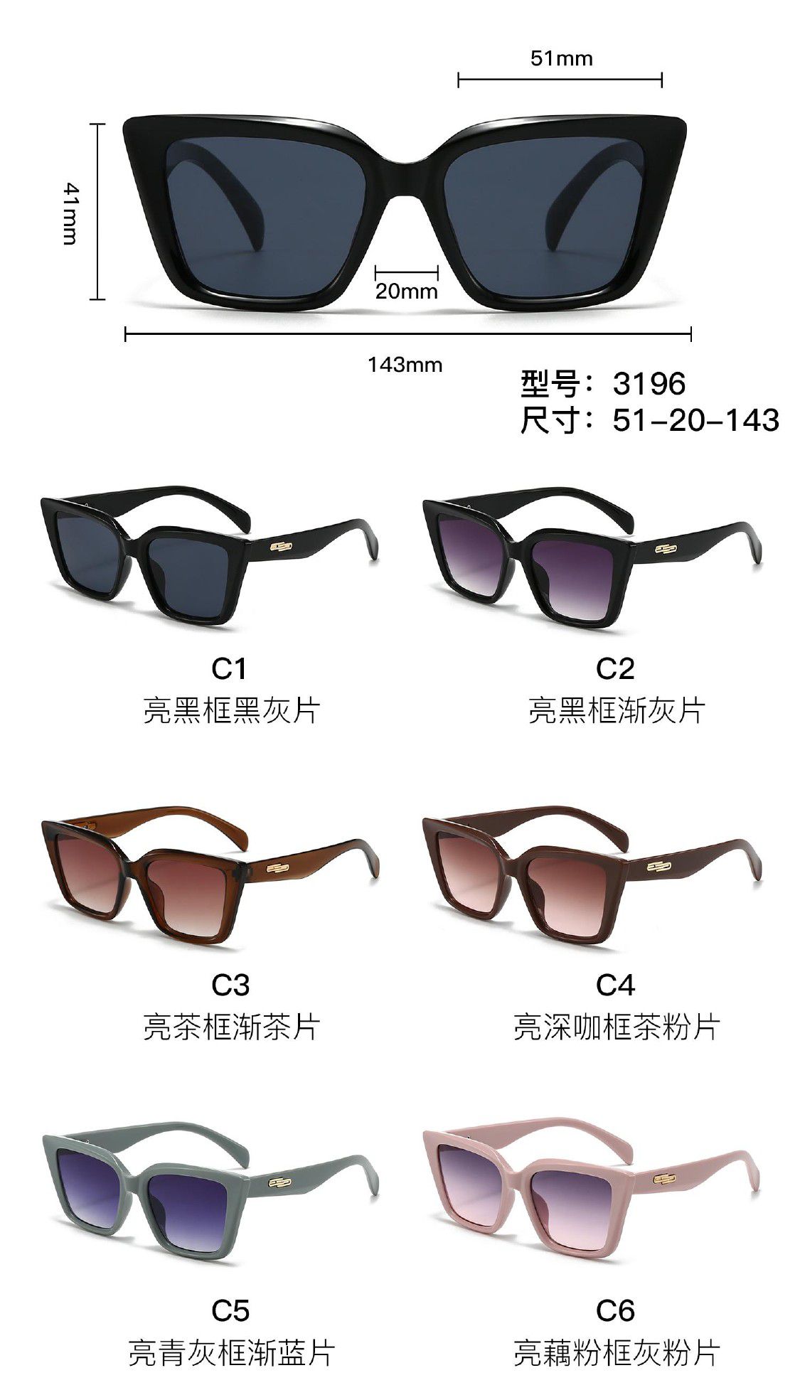 - Size: lens width - 51 mm, bridge distance - 20 mm, temple - 143 mm