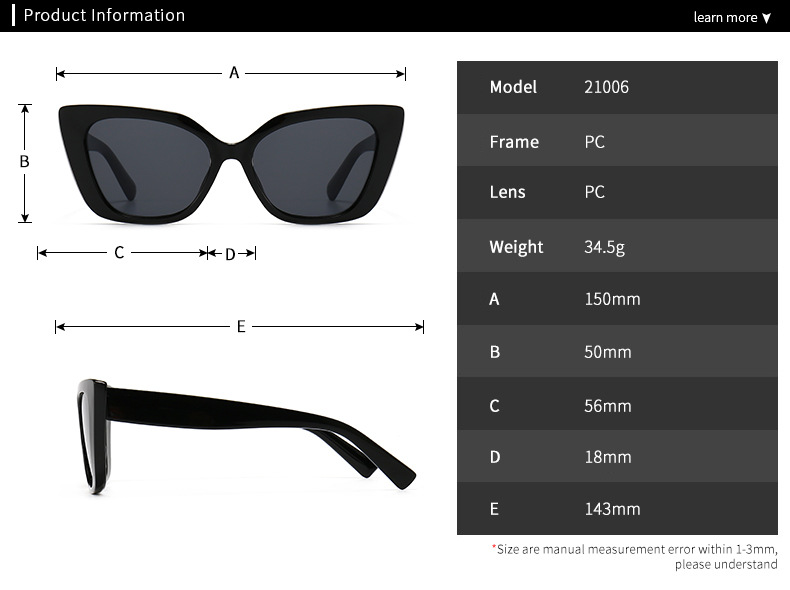 - Size: lens width - 56 mm, bridge distance - 18 mm, temple - 143 mm