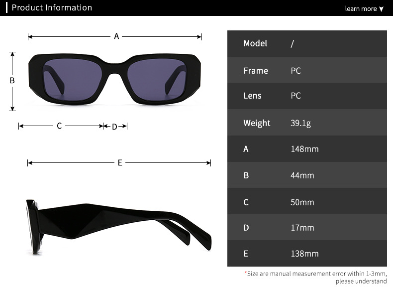 - Size: lens width - 50 mm, bridge distance - 17 mm, temple - 138 mm