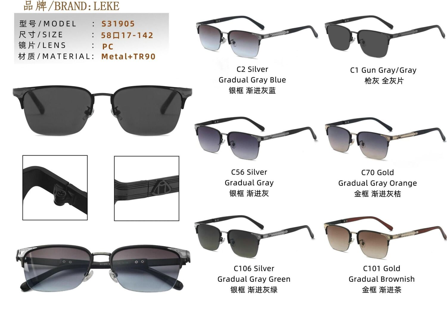 - Frame material: metal + TR90, some parts are made of plastic